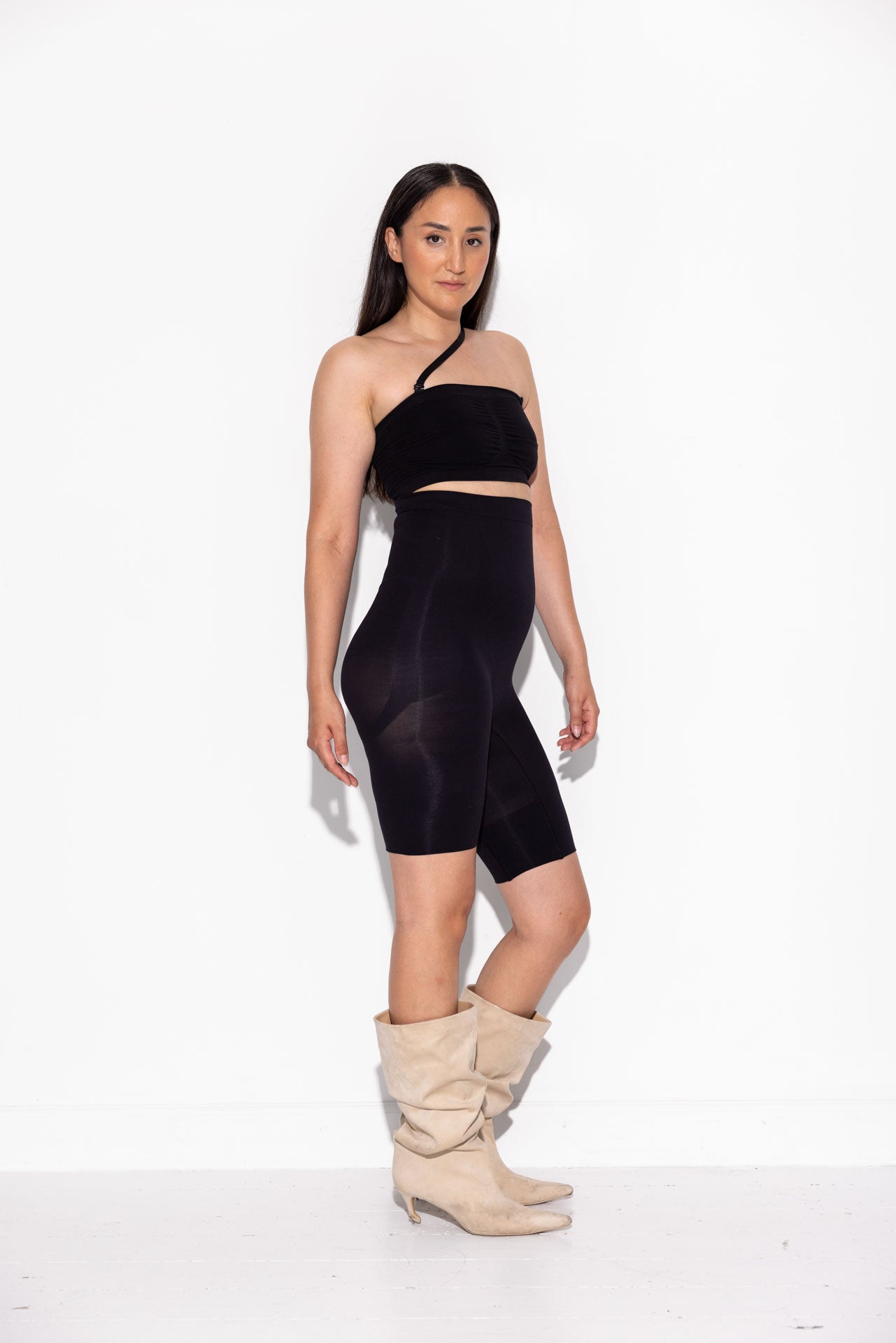 - Silicone tape vi har skabt et helt særligt silicone bånd der sidder inderst langs taljen. Dette sikre at shortsen IKKE ruller og at waistband bliver hvor det skal. Placerer taljen så højt som muligt gerne helt oppe under dit bryst.